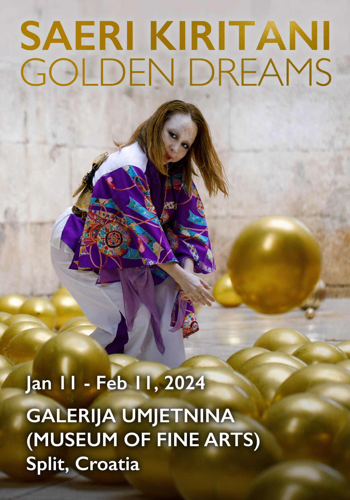 At her second solo exhibition in Split, Saeri Kiritani showcases a multimedia installation titled Golden Dreams, realised through a synergy of video projections on monitors and photographic documentation of two recent site- and context-specific performances, conceived and executed as acts of engagement within the local urban culture. The performances were carried out through interaction with local associations and at locations emblematic and recognisable in Split's current branding as a global tourist attraction: a performance with Diocletian's legionnaires at the Golden Gate and with picigin players at Bacvice beach. Kiritani joined her local collaborators and environment with her performative alter ego, characterised by distinct elements of Japanese culture: a traditional kimono and distinctive white face makeup. The mediator in the orchestrated clash of two cultures is playing with golden balls, known in Japanese culture as kin-tama, carrying traditional symbolism of wealth and prosperity associated with the fertilising function of testicles. During the artist's performance with the local community, the abundant presence of golden balls strewn across widely recognised landmarks in Split primarily signifies how intercultural integration fosters the creative and existential prosperity of the local environment. On the other hand, by staging this performance at two locations representing globally renowned Split landmarks, Kiritani also highlights the destructive aspects of prosperity linked to the monoculture of tourism, a danger particularly affecting the quality of life and opportunities for those local community members who do not participate in it. As part of the exhibition layout, the golden balls scattered on the floor articulate the space between the videos and photographs of the performances. They function as mementos and physical connectors linking the exhibition space with the performance spaces. Most importantly, they offer visitors the opportunity to subsequently engage with them. In the context of prosperity symbolism, they can also be interpreted as a manifestation of the artist's understanding of the importance and role of artistic creation and institutions in the community's prosperity.